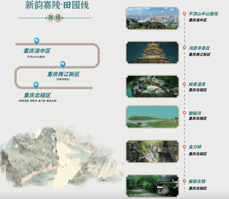 新韵嘉陵·田园轻氧线沿重庆沙坪坝平顶山半山崖线起步,在这里的空中步道感受8D山城的魔幻,步入偏岩古镇感受三百年青石老街的温润烟火,走进金刀峡穿行悬栈飞瀑间体验峡谷探险的酣畅,随后抵达统景温泉,在奇峰幽谷间洗去一身疲乏。