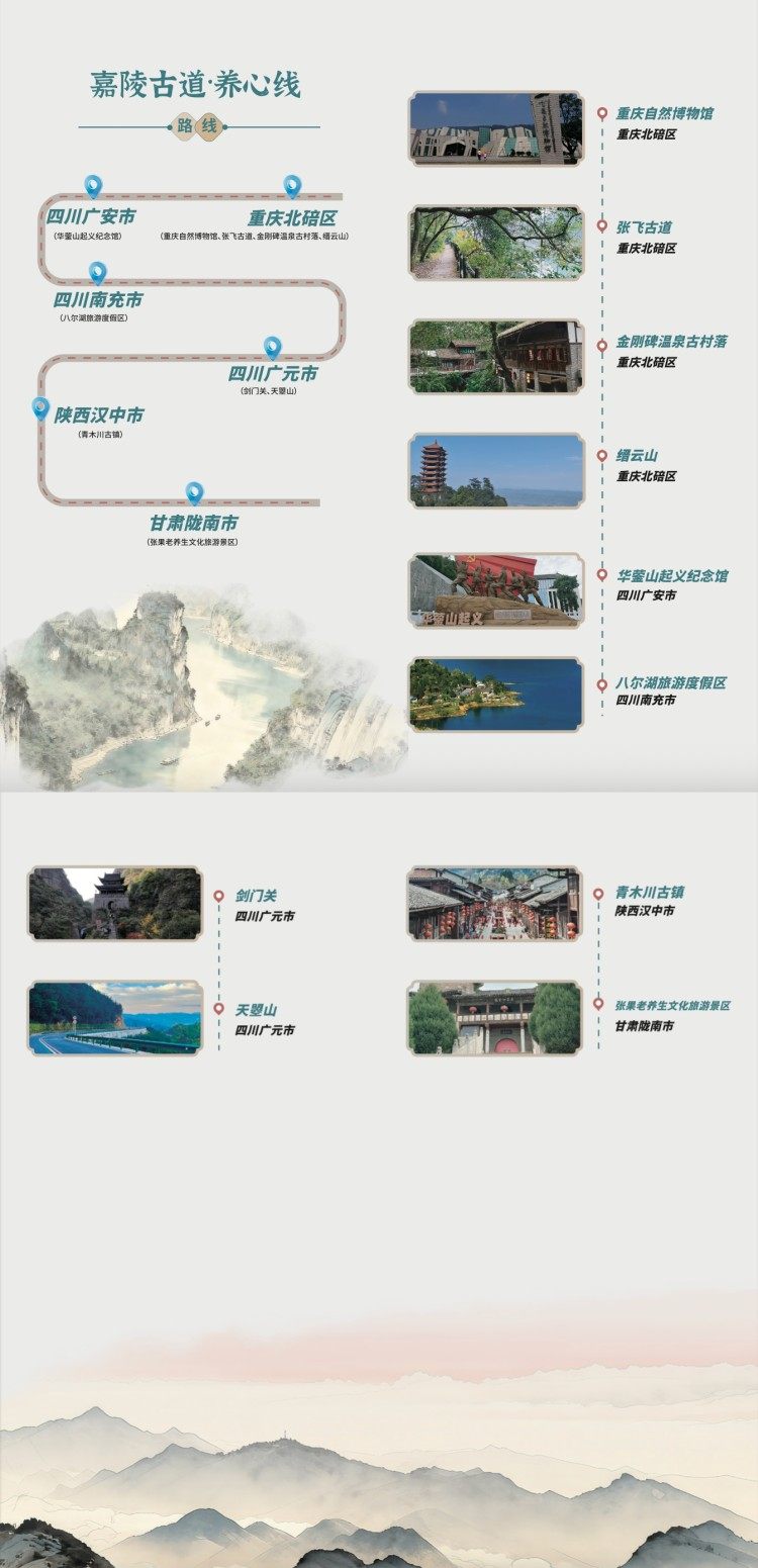 嘉陵古道·养心线则串联起了四地的三国文化、红色记忆、禅道智慧与生态康养。线路全长逾千公里,横跨四省五市,纵贯古今文脉。大家可以从重庆北碚出发,在感受过张飞古道、金刚碑温泉古村落的自然古朴后,可以前往四川广安的华蓥山起义纪念馆回望峥嵘岁月,随后四川广元的剑门关、天曌山也相当值得大家驻足停留;这一路上还有陕西汉中的青木川古镇、甘肃陇南的张果老养生文化旅游景区在等着大家。