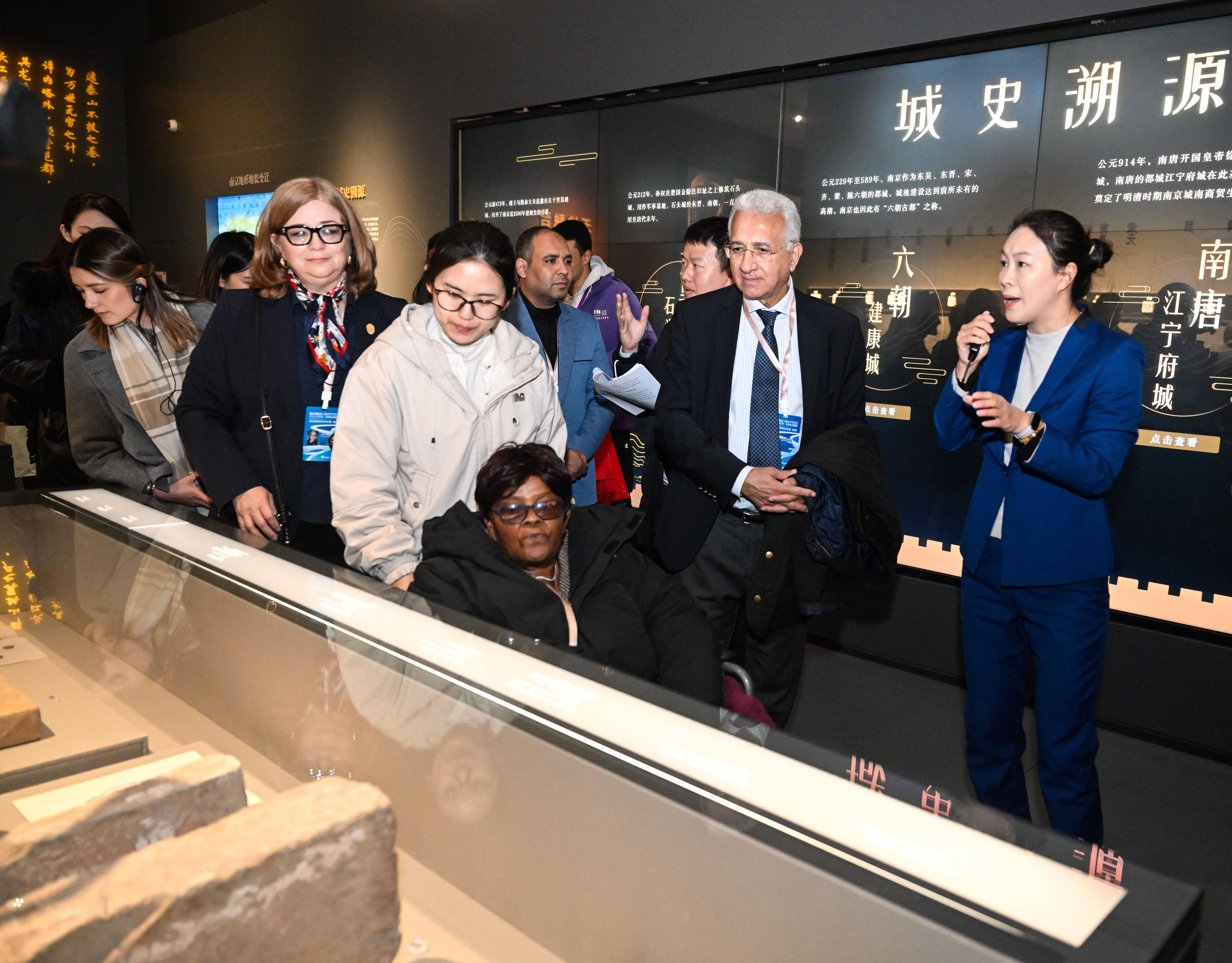 11月19日,嘉宾在南京城墙博物馆参观。新华社记者 季春鹏位于长江流域的中国古都南京,依江而生、因江而兴,既见证了中华文明的多元交融,也经历了东西文明的交流碰撞。如今的南京,不仅保存着2600余处文物古迹,传承着秦淮灯彩、南京云锦等非遗瑰宝,还与210多个国家和地区建立经贸关系,与59个国家的108个城市建立友好关系,传统与现代在这座城市里相得益彰。